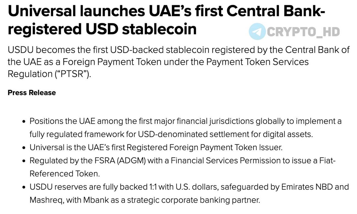 Компания Universal Digital Intl Limited выпустила #USDU — инновационный цифровой актив, получивший официальное одобрение Центрального банка ОАЭ для проведения регулируемых транзакций с криптовалютой. Резервы токена хранятся в ведущих банках страны: Emirates NBD, Mashreq и Mbank. Проект соответствует требованиям Payment Token Services Regulation. Теперь в ОАЭ легально можно проводить расчёты с цифровыми активами и деривативами через подобные токены. Крипто Эстет | Новости криптовалют