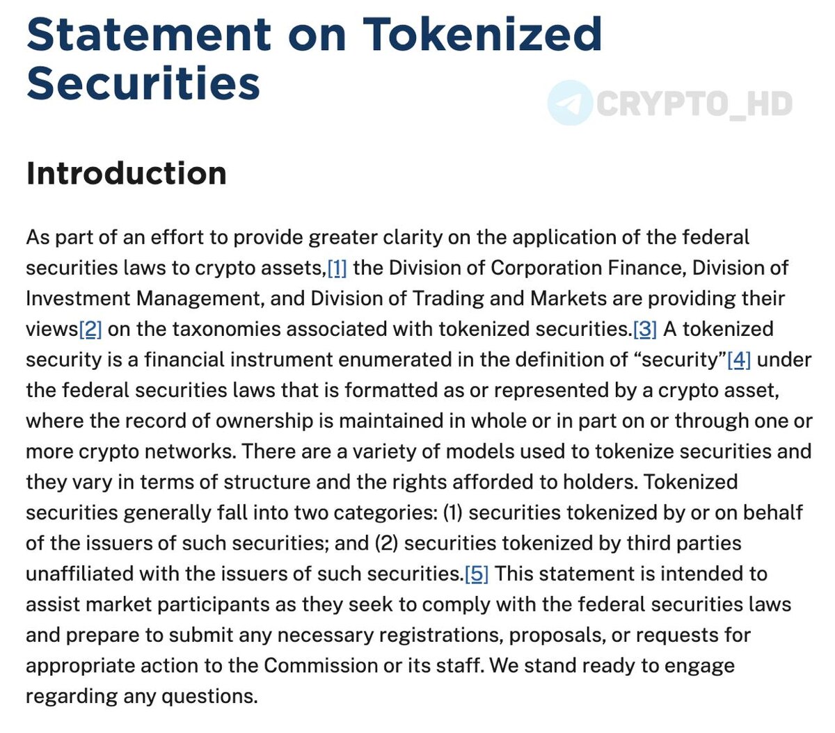 😐 Токенизированные акции и облигации — ценные бумаги. В SEC опубликовали разъяснение — если актив по своей сути является ценной бумагой, он остается ею независимо от того, где ведется учет — в блокчейне или в традиционной базе данных. Формат учета (ончейн или офчейн) не меняет требований по регистрации и защите инвесторов. Токенизированные акции и облигации подпадают под те же правила, что и классические инструменты. Cryptо Headlines
