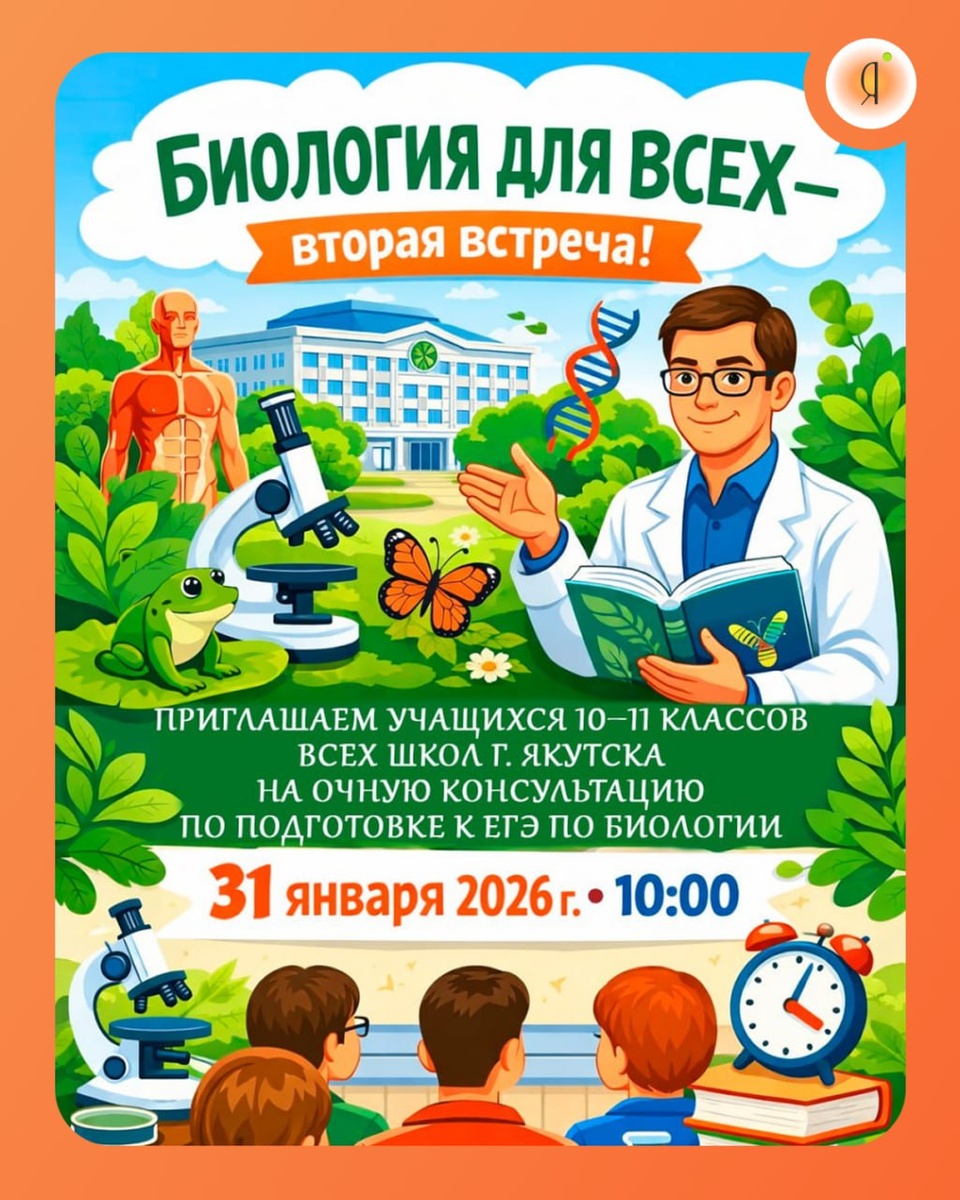 » #МК Арктический государственный агротехнологический университет приглашает учащихся 10–11 классов всех школ г. Якутска на очную консультацию по подготовке к ЕГЭ по биологии. 👥 Формат: живая работа + подробный разбор заданий ЕГЭ Ведущий — Евгений Евгеньевич Степура - кандидат биологических наук, доцент кафедры морфологии, физиологии сельскохозяйственных животных и экологии им. профессора И. С. Решетникова (АГАТУ), соавтор школьного практикума по биологии (9 класс, ФГОС РФ), опыт подготовки к ЕГЭ и ОГЭ по биологии и химии (Рязань, Москва), участник разработки пробных вариантов ОГЭ и ЕГЭ по биологии 31 января | 10:00-12:00 300 руб. Подробнее Online Якутия | Ждем вас в МАХ