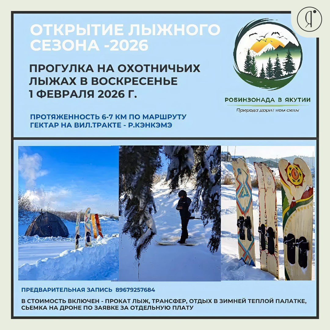 #ЗаГородом Программа дня: 09:00 – Сбор на 203 мкр. 10:00 – Приезд на место, установка зимней палатки, растопка печки, чаепитие 11:00–14:00 – Лыжная прогулка по урочищу (6–7 км) 14:00–15:00 – Отдых в тёплой палатке, чаепитие, сборы 15:30–16:30 – Возвращение к месту сбора Что взять с собой: перекус и горячее питьё; запасную одежду, перчатки/варежки и удобную непромокаемую обувь (без металлических шипов) Оператор обеспечит: - охотничьи лыжи - палатку с печкой - сопровождение 1 февраля Маршрут: Гектар на Вил.тракте - реки Кэнкэмэ 2500 руб. +79679257684 Online Якутия | Ждем вас в МАХ