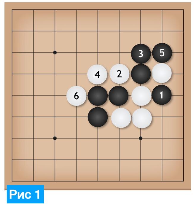 Рассмотрим одну идею на примерах разной сложности: на партии новичков и на игре профи. Тема разбора: видеть большую картину. Нередко бывает, что локально хорошее решение плохо работает с точки зрения всей позиции, то есть оно не вписывается в гармонию уже стоящих на доске камней. Лучшие ходы одновременно играют как в малом масштабе, так и в большом. В этом секрет эффективных стратегий Го. На рис. 1 пример из игры начинающих. Черные последовательно окружают белый камень справа. Белые, видимо, по инерции движутся прочь от черных влево. Серией своих ходов с 1 по 5-й камень черные съедают отмеченный белый камень справа. Это хорошие локально ходы, но в реальности игры есть более ценное направление, которое черные упускают. Дело в том, что в результате три черных камня в центре постепенно окружаются белыми. И сейчас черные могут быть захвачены, что показано на рис. 2. Сопротивление бесполезно, так как белые загоняют группу черных с помощью приема «лестница» к краю доски и захватывают
