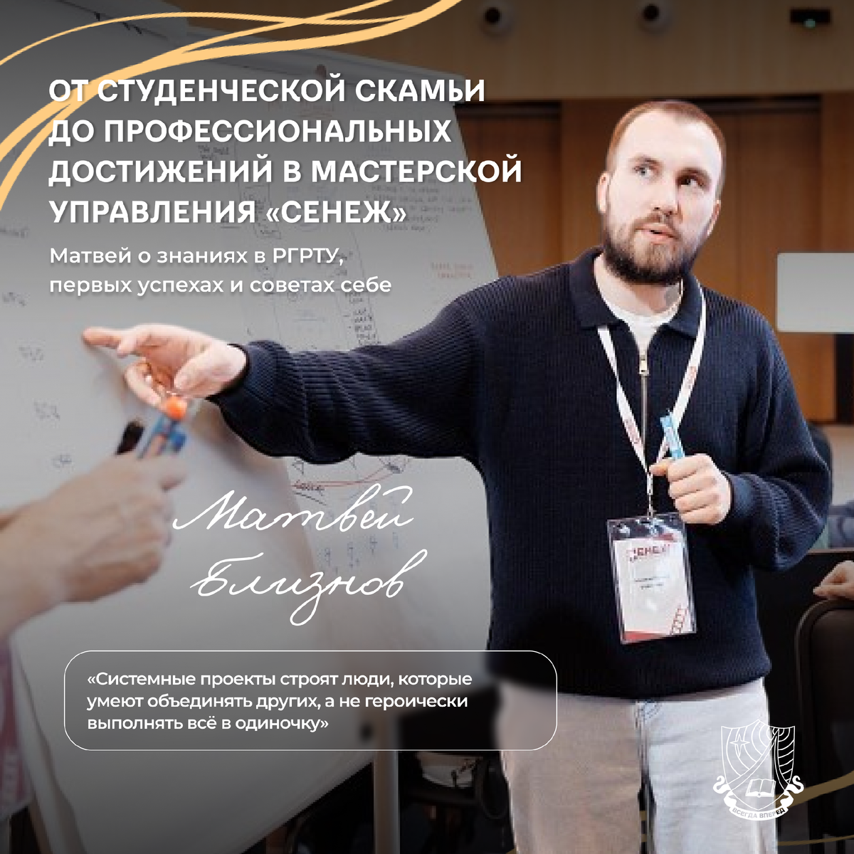 В нашей рубрике мы рассказываем, куда идут выпускники РГРТУ, чему научились за годы учёбы и как складывается их профессиональный путь после вуза. Сегодня расскажем о Матвее Близнове — выпускнике РГРТУ 2023 года. За это время Матвей успел набрать серьёзный опыт работы в региональных структурах, а сейчас продолжает профессиональный путь в Мастерской управления «Сенеж». Чувствовать подвижность рамок.