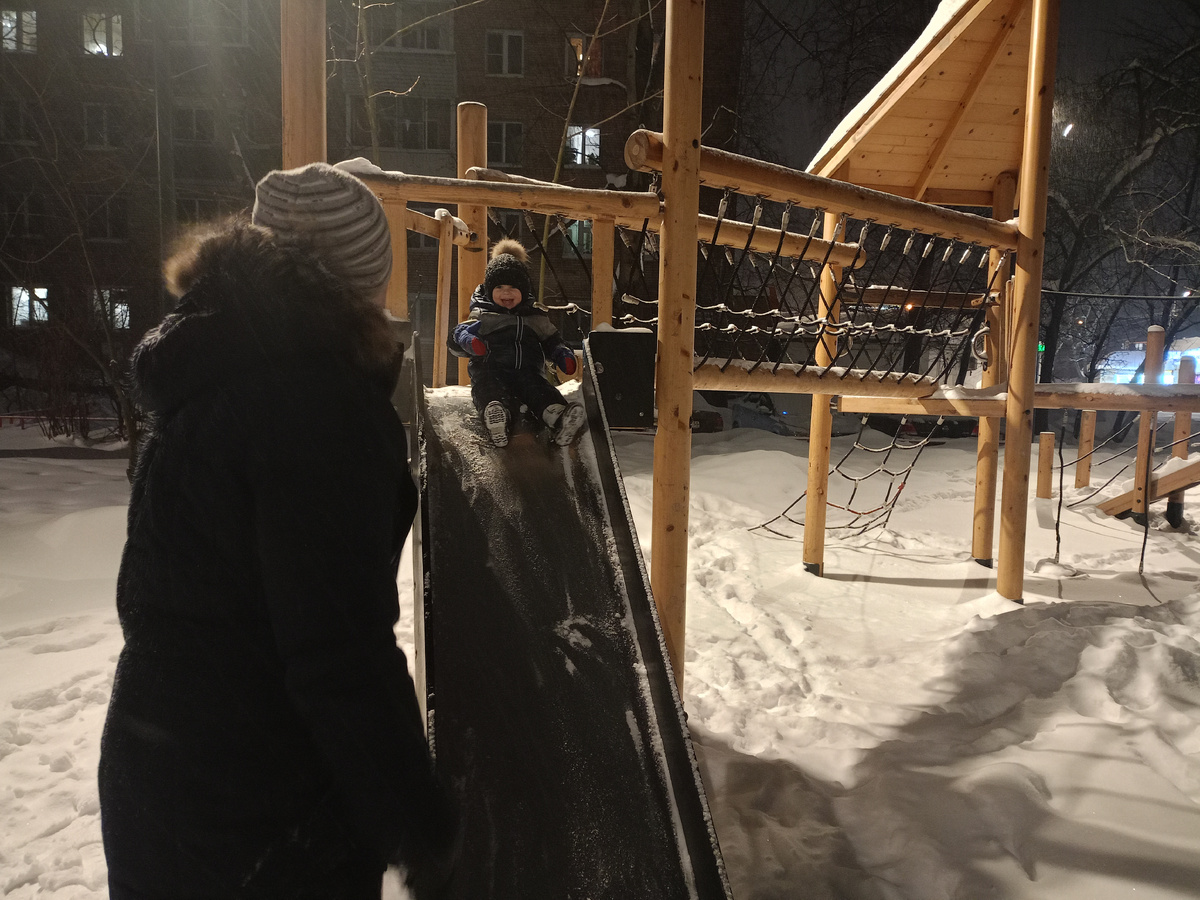 С папой гулять весело, снег с горки расчистит и ребёнка ловить будет.