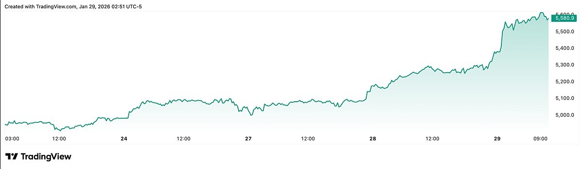 В ходе торгов 29 января 2025 года стоимость февральского фьючерса на золото превысила $5600 за унцию. Мартовский фьючерс на серебро преодолел отметку в $120 за унцию. Причины — сохраняющаяся геополитическая напряжённость и ослабление доллара, повторяют аналитики. В Deutsche Bank прогнозируют, что в 2026 году золото может подорожать до $6000 за унцию vc.ru/invest/2711579