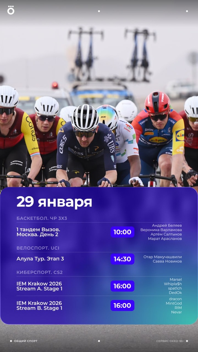 Перед ЛЕ смотрим велоспорт, киберспорт и баскетбол. Самое то разогреться перед вечером! 💪🏻 https://okko.tv/s/4ot