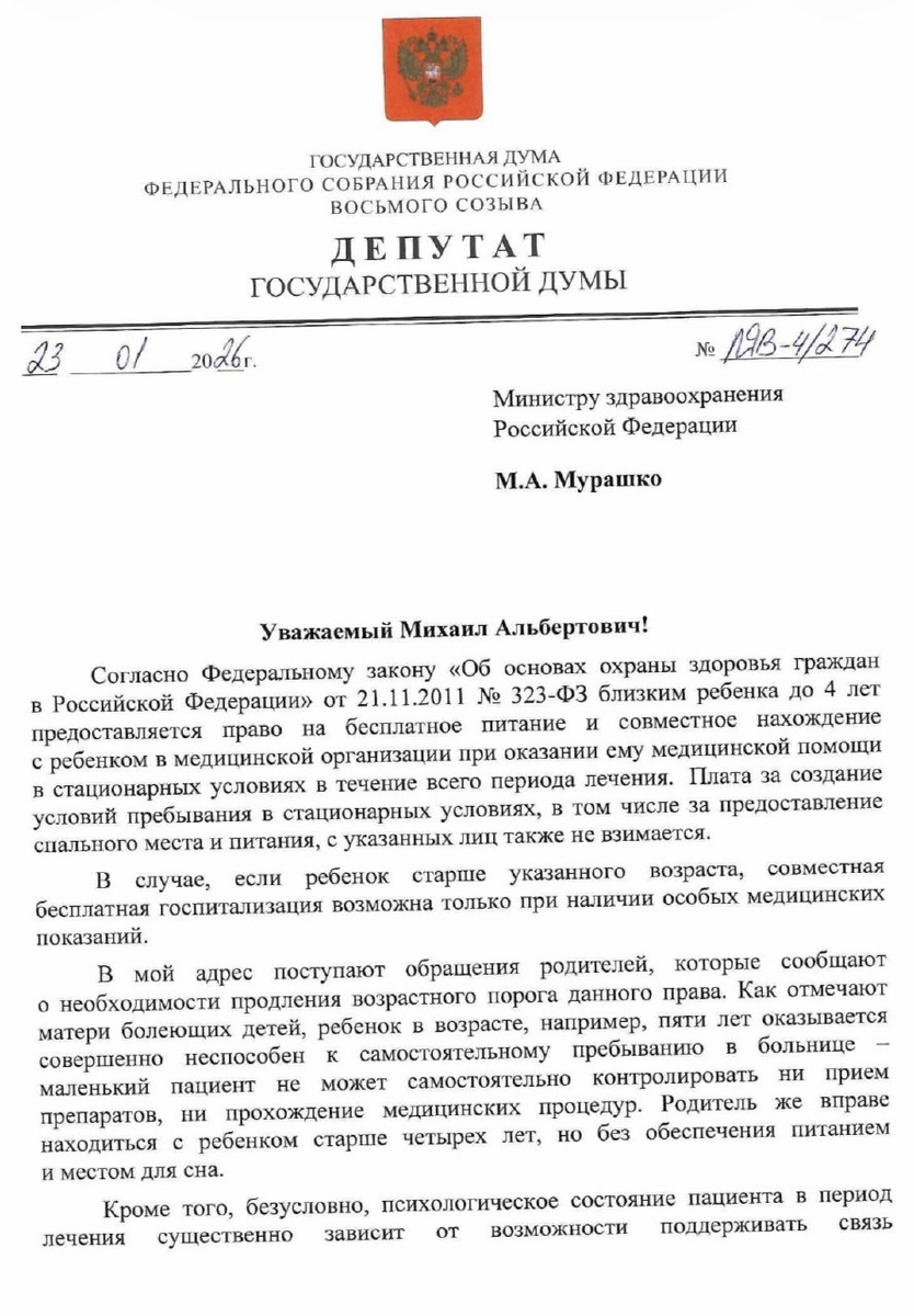 Направила письмо министру здравоохранения РФ Михаилу Мурашко с предложением повысить до семи лет возраст детей, с которыми родители могут бесплатно находиться в стационарах, включая предоставление питания и спального места. 💬Сейчас по закону это гарантировано только для родителей детей до четырех лет. В мой адрес регулярно поступают обращения родителей, которые указывают, что дети в возрасте пяти-шести лет зачастую не могут сами контролировать прием лекарств или прохождение процедур. Родитель же вправе находиться с ребенком старше четырех лет, но без обеспечения питанием и местом для сна. Разлука с близкими негативно отражается на психологическом состоянии детей. Для них пребывание в стационаре без поддержки семьи может стать серьезной травмой, усиливающей страх и стресс во время лечения. Кроме того, нахождение родителей вместе с детьми и их самостоятельная забота о них снизит нагрузку на медицинский персонал организации. #Инициатива