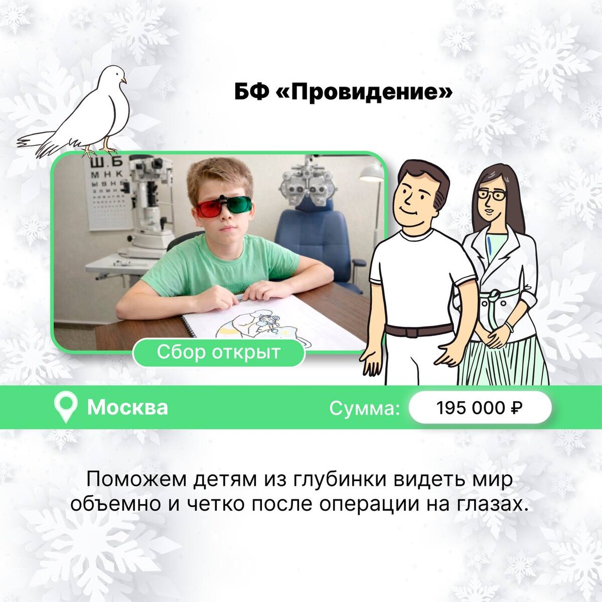 📍 Москва Илюша с тяжёлой формой косоглазия пережил больше десяти операций, глаза были «шитые-перешитые». Врачам удалось выровнять положение глаз. Но главное – научить мозг снова «собирать» картинку от двух глаз в одно объёмное изображение (бинокулярное зрение). Для реабилитации необходимы анаглифные наборы, большинству детей из глубинки они недоступны из-за цены, особенно, если мама воспитывает ребёнка одна. Один комплект – 7 500 рублей. Московский фонд «Провидение» помогает детям в регионах продолжать лечение дома со специальными раскрасками и стереоочками. Пусть у Ильи и других детей будет всё необходимое для реабилитации дома! 📍 Москва Елену сбил автомобиль на пешеходном переходе, в 57 лет она заново училась дышать, говорить и ходить, но упав дома, осталась прикованной к постели одна. В Свято-Димитриевском сестричестве Елену спасли и ухаживают за ней сегодня. Уже 35 лет патронажные сёстры помогают тяжёлобольным одиноким людям, ежегодно опекая тысячи. У них нет средств, что
