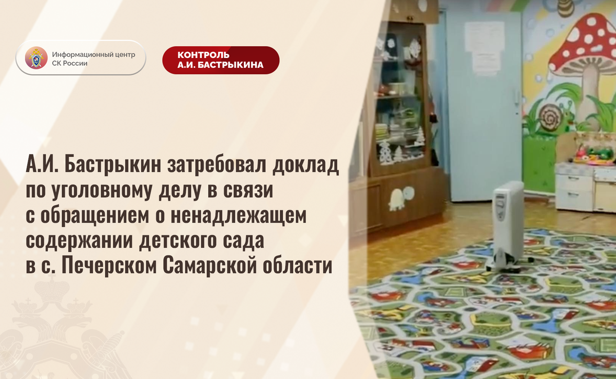 А.И. Бастрыкин затребовал доклад по уголовному делу в связи с обращением о ненадлежащем содержании детского сада в с. Печерском Самарской области В комментариях в аккаунте приёмной Председателя СК России А.И. Бастрыкина «ВКонтакте» размещено обращение по вопросу ненадлежащего содержания детского сада в селе Печерском Самарской области. Здание дошкольного учреждения находится в ветхом состоянии, межэтажные и напольные перекрытия разрушаются, уборка территории должным образом не осуществляется. При этом температурный режим в группах и санитарных помещениях не соответствует установленным нормам, в результате сотрудники учреждения вынуждены использовать электрообогреватели, что представляет опасность для воспитанников. Обращения в компетентные органы результатов не принесли, ремонтные работы в полном объеме не выполнены. В СУ СК России по Самарской области расследуется уголовное дело. Председатель Следственного комитета Российской Федерации Александр Иванович Бастрыкин затребовал у руково