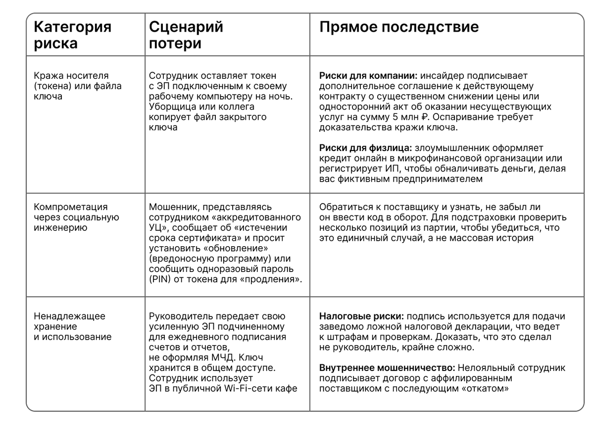 Недостаточная защита электронной подписи создает в первую очередь юридическую и финансовую уязвимость. Получив доступ к ключу ЭП, злоумышленник может: