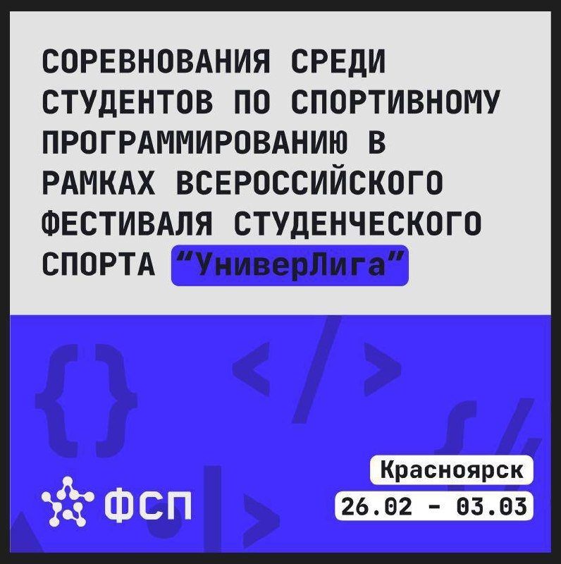 ! С 26 февраля по 3 марта 2026 года Красноярск станет площадкой для масштабных соревнований по спортивному программированию в рамках Всероссийского фестиваля студенческого спорта «УниверЛига». Это не просто конкурс — это пространство для роста, обмена опытом, поиска единомышленников и проверки собственных возможностей. Участников ждут реальные задачи, высокий темп, командная работа и мощная атмосфера профессионального азарта. К участию приглашаются студенты вузов и профессиональных образовательных организаций РФ в возрасте от 16 до 35 лет. Даты проведения: 26 февраля — 3 марта 2026 года Место проведения: г. Красноярск Подробная информация и регистрация: https://hackrus.ru/1127 #хакатон #hackathon #hackathonsrus #хакатонырус хакатоны.рус — открой с нами мир хакатонов