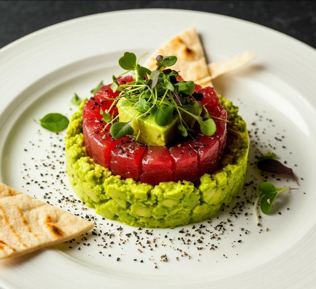 5. 🍽️ Подача: На сервировочные тарелки поставьте кулинарное кольцо или просто сформируйте круг. Выложите слой авокадо, слегка утрамбуйте. Сверху выложите слой тунца, также утрамбуйте. Аккуратно снимите кольцо. Сверху нанесите точки или полоски васаби-крема. Посыпьте кунжутом. Подавайте немедленно с чипсами из лаваша.