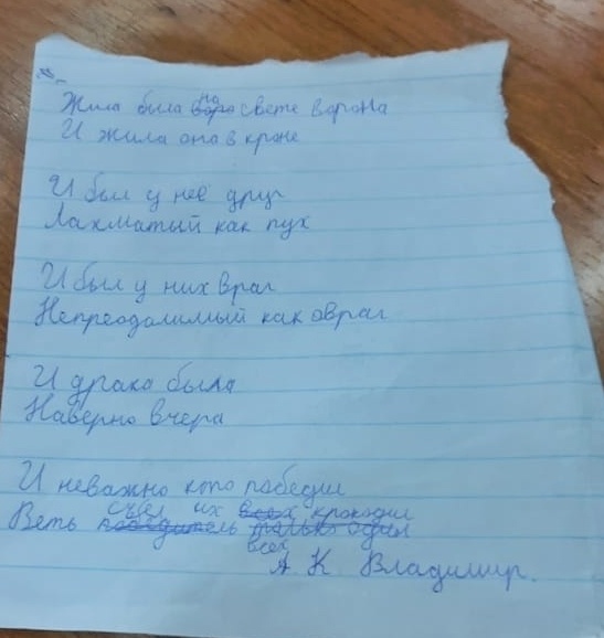 Добрый день, друзья. У меня все хорошо. Пропадала я из-за смены работы. Было очень много новых задач и дел. Соскучилась! Надеюсь, очень скоро вернусь к вам в привычном ритме. Сегодня хочу поделиться с вами сегодняшней находкой - стихотворением моего сына. Оно показалось мне таким непосредственным и веселым, что я не могу не показать его вам. Надеюсь, вызовет и у вас улыбку! Всем хорошего дня и настроения. Жила-была на свете ворона, И жила она в кроне. И был у нее друг - Лохматый, как пух. И был у них враг, Непреодолимый, как овраг И драка была, Наверное, вчера. И неважно кто победил, Ведь съел их крокодил.
