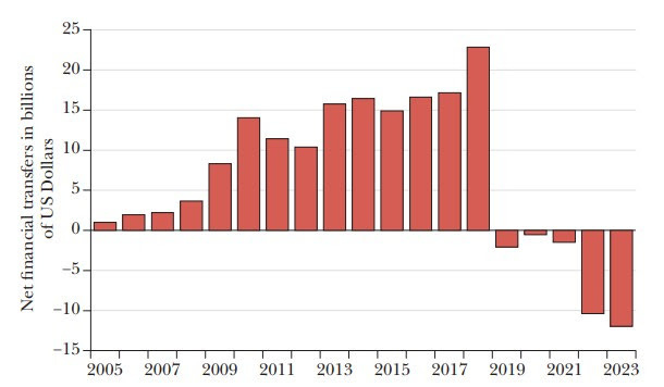 В течение 2010-х гг. кредитование Китаем развивающихся стран было большой темой, поскольку все опасались, что КНР предоставляет деньги на проекты, которые не имеют экономического смысла, а затем захватывает контроль над местными активами, когда заёмщик объявляет дефолт. Недавно группа аналитиков, совместно с Кармен Рейнхарт, опубликовала обновлённую информацию о кредитном портфеле Китая и его развитии с течением времени. Особенно поражает здесь тот факт, что с 2019 г. чистые трансферты между Китаем и развивающимися странами стали отрицательными, то есть Китай предоставляет этим странам меньше новых кредитов, чем получает в виде обслуживания долга и погашения кредитов. Отмена китайской кредитной политики. Источник: Хорн и др. (2025) Я был удивлен, увидев это, потому что думал, что китайские кредиты продолжают поступать в развивающиеся страны, но диаграмма ниже показывает, что Китай фактически прекратил наращивать свой кредитный портфель в конце 2010-х гг. Объёмы кредитования развивающих