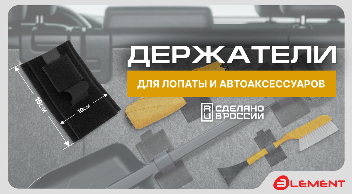 В багажнике часто лежит то, что нужно «на всякий случай»: лопата, щётка, трос, инструменты. Пока машина стоит — всё нормально. В движении же эти вещи начинают смещаться, стучать, царапать пластик и просто мешать пользоваться багажником. Мы сделали универсальные держатели, которые решают эту проблему без сложного монтажа и лишних деталей. Как это работает Комплект состоит из двух держателей, предназначенных для фиксации автомобильной лопаты, щётки или другого инструмента. Они удерживают предметы на месте, не давая им смещаться даже при активной езде. Два варианта крепления Мы предусмотрели разные типы багажников, поэтому держатели можно установить: на текстильные поверхности с помощью липучки