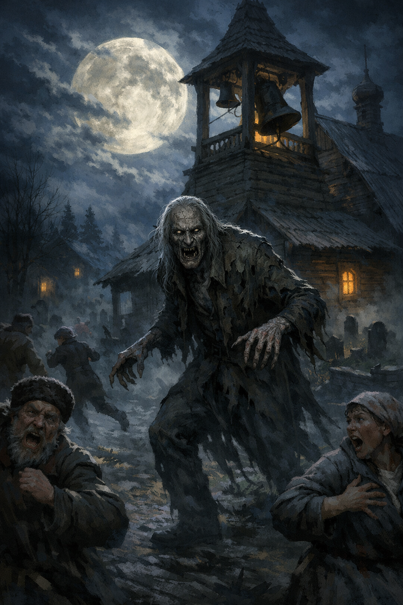 Прохор завыл — долго, надрывно. Крик разнёсся по деревне. В окнах зажглись огни. Люди выбежали, с вилами, факелами, страхом. И увидели.