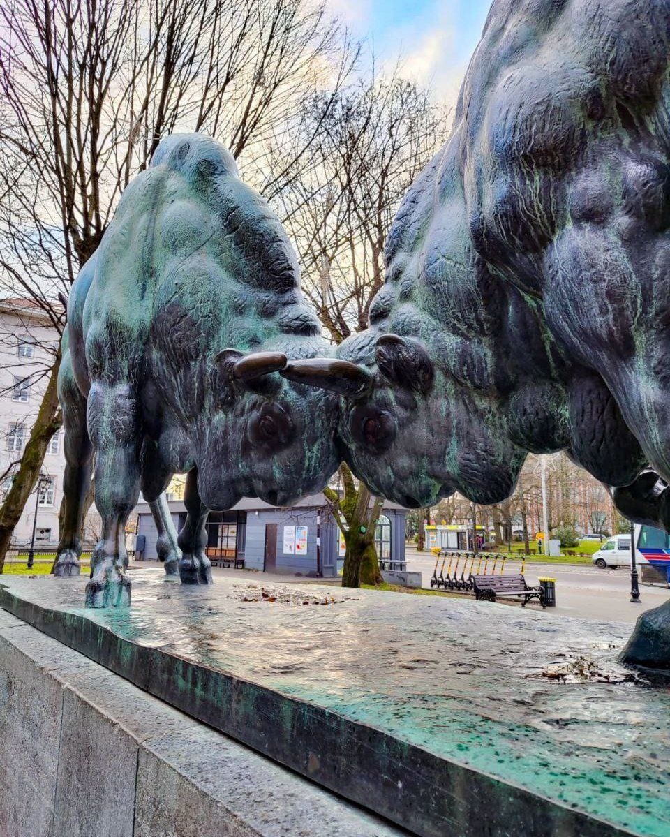 Но это не главное… На улице Театральной, напротив здания бывшего суда (ныне — университет), уже более ста лет стоят два мощных зверя, сцепившихся в яростной схватке. Это — «Борющиеся зубры», работа скульптора Августа Гауля. Но почти никто их так не называет. --- ### ⚖️ Кто они на самом деле? Сразу после установки горожане прозвали их «Прокурор и защитник» — ведь стояли-то напротив суда! Позже, когда здание стало университетом, студенты переосмыслили: — «Это же студент и профессор! Один пытается сдать, другой — завалить!» Так скульптура стала живой частью городского фольклора. --- ### 🎨 А потом началась… Пасха Студенты — народ изобретательный. И каждый год, на Пасху, они тайно приходили к зубрам и красили их… ну, вы поняли — яркой краской, со всей душой. Зубры молчали. Городская администрация — нет. Оттирать краску было мучительно. Но традиция жила — пока не появились камеры «Безопасного города». С тех пор быки (то есть зубры) стоят в полном достоинстве. Хотя, говорят, по но