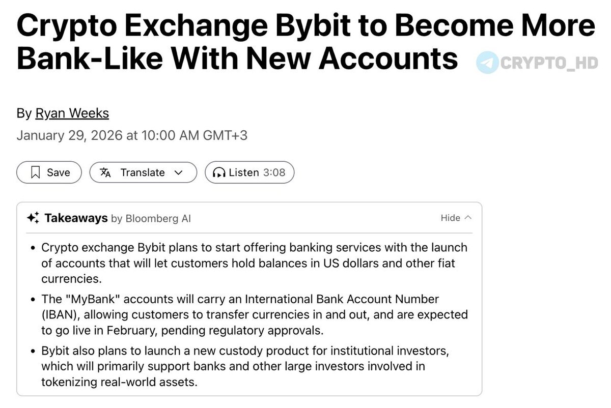 Криптобиржа запускает собственные фиатные счета с IBAN (международный номер банковского счета) и фактически делает шаг в сторону полноценного банковского сервиса. Что известно: • Пользователи смогут хранить доллары США и другие фиатные валюты прямо на бирже. • Счета MyBank получат IBAN и позволят переводить деньги в 18 валютах. • Запуск ожидается в феврале, после одобрения регуляторов. • Инфраструктура запускается при поддержке банков-партнеров. Cryptо Headlines