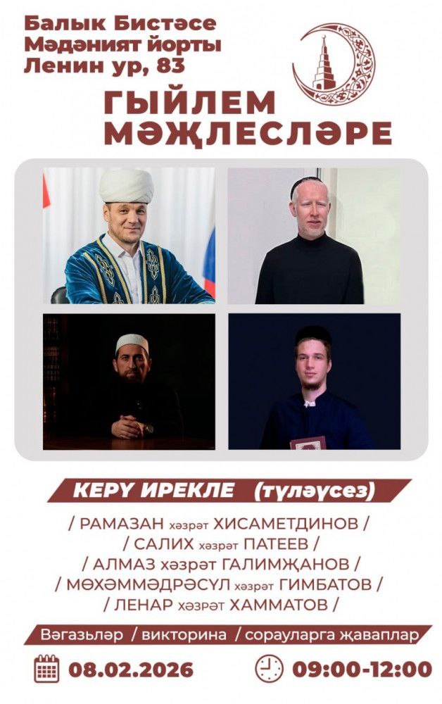 📿🤲В Рыбной Слободе состоится очередная встреча хазратов с населением под названием «Гыйлем мәҗлесләре». Мероприятие организуется отделом дагвата (просвещения) Муфтията Татарстана. 📅Дата: 8 февраля (воскресенье). 📍Место: пгт Рыбная Слобода, ул.Ленина, д.83г. ⏰Время: 9.00-12.00. ❗️В рамках этой встречи представители ДУМ РТ расскажут мусульманам о достоинствах благословенного месяца Рамадан, значении Ночи аль-Кадр (Кадер кичәсе), а также поделятся наставлениями о важности соблюдения уразы, поклонения, изучения и чтения Священного Куръана. 🎤В числе спикеров – имам-мухтасиб Рыбно-Слободского района Рамазан хазрат Хисамутдинов, заместитель имам-мухтасиба Сабинского района по работе с молодежью Алмаз хазрат Галимзянов, заместитель председателя Комитета Халяль ДУМ РТ Салих хазрат Патеев, начальник отдела дагвата (просвещения) Муфтията РТ Ленар хазрат Хамматов, а также известный проповедник Мухаммадрасул хазрат Гимбатов. 🗓️Приглашаем всех желающих присоединиться! Наш канал в МАХ