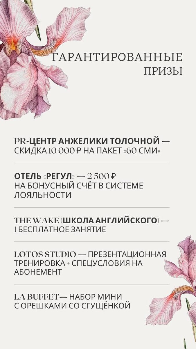 ✨ 🤍 Я являюсь амбассадором этих компаний и именно поэтому могу дарить и радовать вас классными подарками и бонусами. Очень люблю партнерства «по любви», когда пользуюсь услугами сама. Смело звоните и говорите, что вы от Анжелики Толочной — для вас уже подготовлены приятные призы и специальные условия ✨ PR-центр Анжелики Толочной дарит скидку 10 000 ₽ на пакеты публикаций. https://pr-smi.tb.ru/ Здравница «Лаго-Наки» Скидка на все программы от 7 суток для двоих гостей🔥 Подробнее по ссылке: https://lagonaki.com/offers/lagonaki777/ Отель RADISSON BLU ROSTOV (На Набережной) скидка - 10% на бронирование номера по промокоду “Angelika”+конфеты ручной работы в подарок! 💝 Студия фейсфитнеса IDOL FACE на Соколова, 68 Подарок 🎁 Бесплатный Массаж головы (полноценная услуга) https://idolface-salon.ru/rnd_sokolova Отель «Регул» начисляет 2 500 ₽ на бонусный счёт в системе лояльности https://regulaparts.uds.app/c/join?ref=fkxk8124 The Wake — школа английского языка — 1 бесплатное занятие д