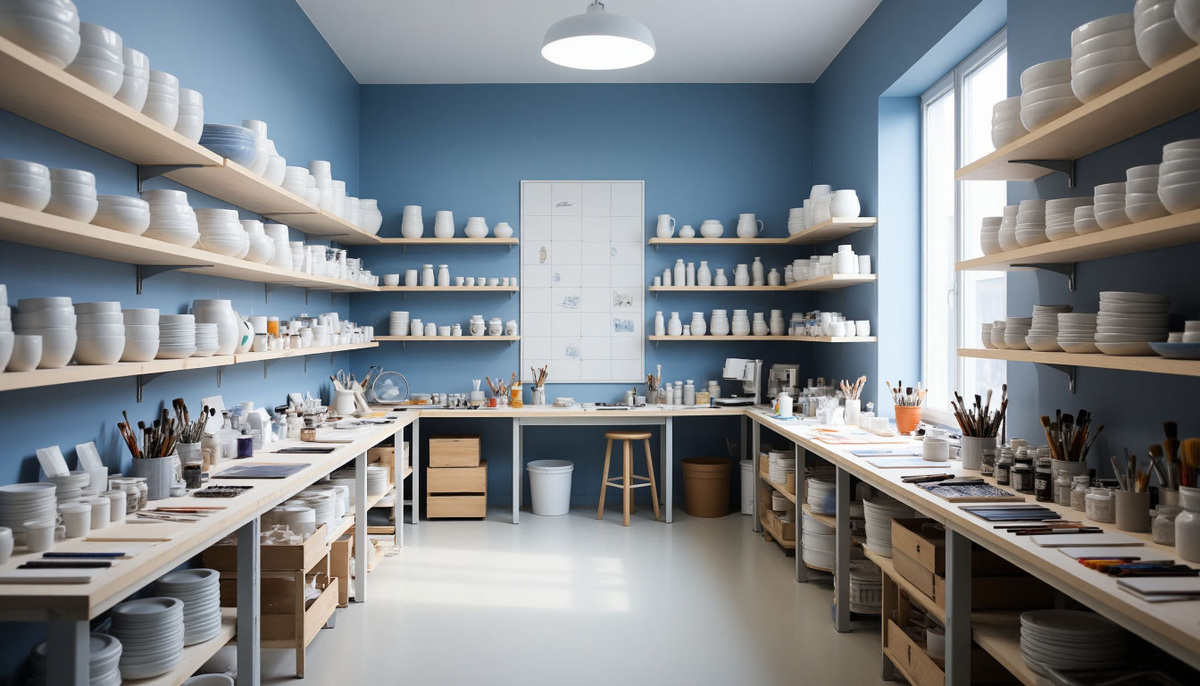 За массивной дверью с матовым стеклом скрывается пространство, где рождается фарфор — материал, соединяющий в себе хрупкость и вечную красоту. В мастерской царит особый микроклимат: умеренная влажность, стабильная температура около 20−22∘C и приглушённый свет, не искажающий оттенки глазури. Воздух наполнен тонким ароматом влажной глины и минеральных пигментов. Простор зонирован на участки: Каждый шедевр рождается из сочетания науки и искусства. Мастер-скульптор не просто создаёт форму — он управляет трансформацией материи, превращая глину в вечный фарфор.