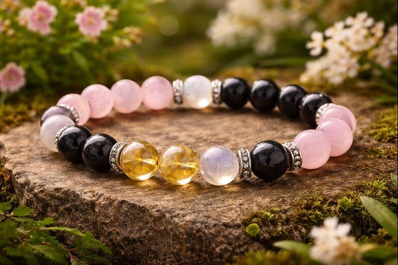 В этом браслете четыре камня: цитрин, лунный камень, розовый кварц и оникс. Я подбирал их так, чтобы каждый выполнял свою задачу, а вместе они создавали единое поле для человека с огненной природой.