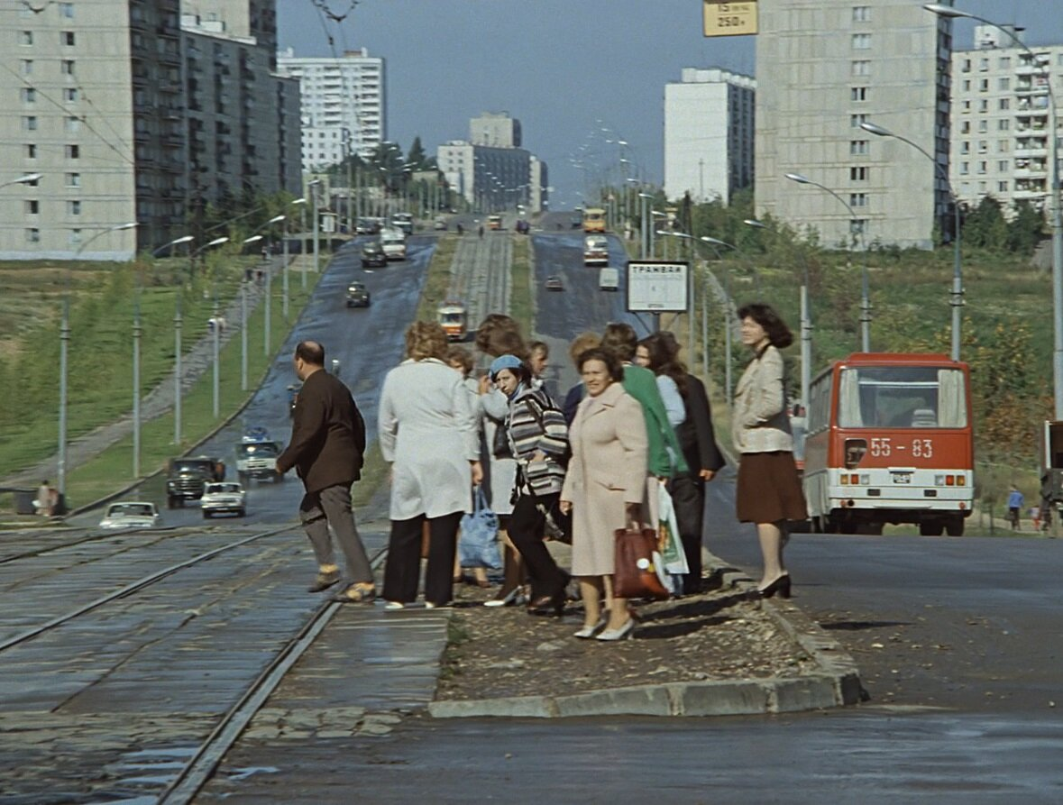 На самом деле, остановка несколько южнее, ну а в кадре знаменитого фильма хорошо видны дома 43 корпус 1 и 48 корпус 1 по Чертановской улице. Жаль, что с тех лет их частично закрыли более поздними строениями.
