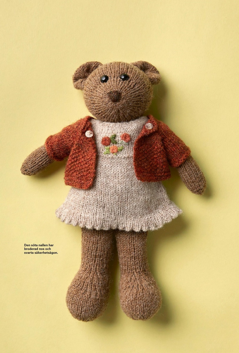 Необходимое количество пряжи: 50 г коричневой пряжи достаточно для плюшевого мишки, 50 г зеленой для свитера и штанов и 10 г золотисто-желтой для узора свитера, 50 г бежевой для платья, штанов, варежек и сумки и около 25 г ржаво-коричневой для кардигана и вышивки. Небольшие остатки красной, темно-оранжевой, светло-оранжевой и светло-зеленой пряжи для вышивки и темно-коричневой для носа.
