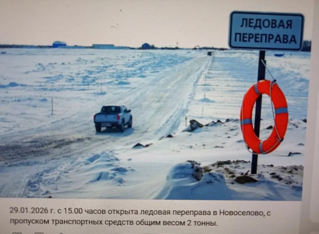 С 15.00 ч. 29.01.2026 г.открыта ледовая переправа в с.Новоселова, с допуском ТС общим весом 2 тонны.