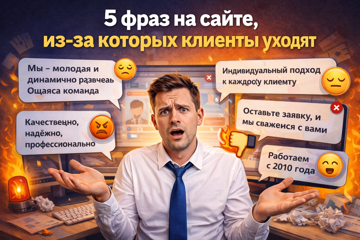 Все пламенный Хай, на связи Алексвеб. Я собрал для вас ТОП -5 фраз на сайтах, от которых клиенты закрывают вкладку быстрее, чем ты успеваешь сказать “опа, еще заявка пришла”. И самое смешное — эти фразы стоят на каждом втором сайте. Люди их видят. Мозг говорит «понятно». Рука тянется к крестику. Лови 5 фраз на сайте, из-за которых клиенты уходят, даже если у тебя нормальный продукт и адекватные цены. Поздравляю. Ты сказал НИЧЕГО. Клиент читает это и думает: — и чё? — мне от этого легче? — мне звонить или бежать? Эта фраза не отвечает НИ НА ОДИН вопрос клиента. Она просто занимает место. По факту это переводится как: «Мы не знаем, что написать, поэтому лепим эту шляпу». Любимая. Если бы мне платили по рублю за каждый «индивидуальный подход», я бы уже купил Яндекс. Проблема простая: 👉 так пишут ВСЕ. Клиенту не нужен «подход». Ему нужно понять: — ЧТО конкретно ты сделаешь — КАК это решит его проблему — СКОЛЬКО это стоит А «индивидуальный подход» — это пустой звук. Как «воздух вкусный».