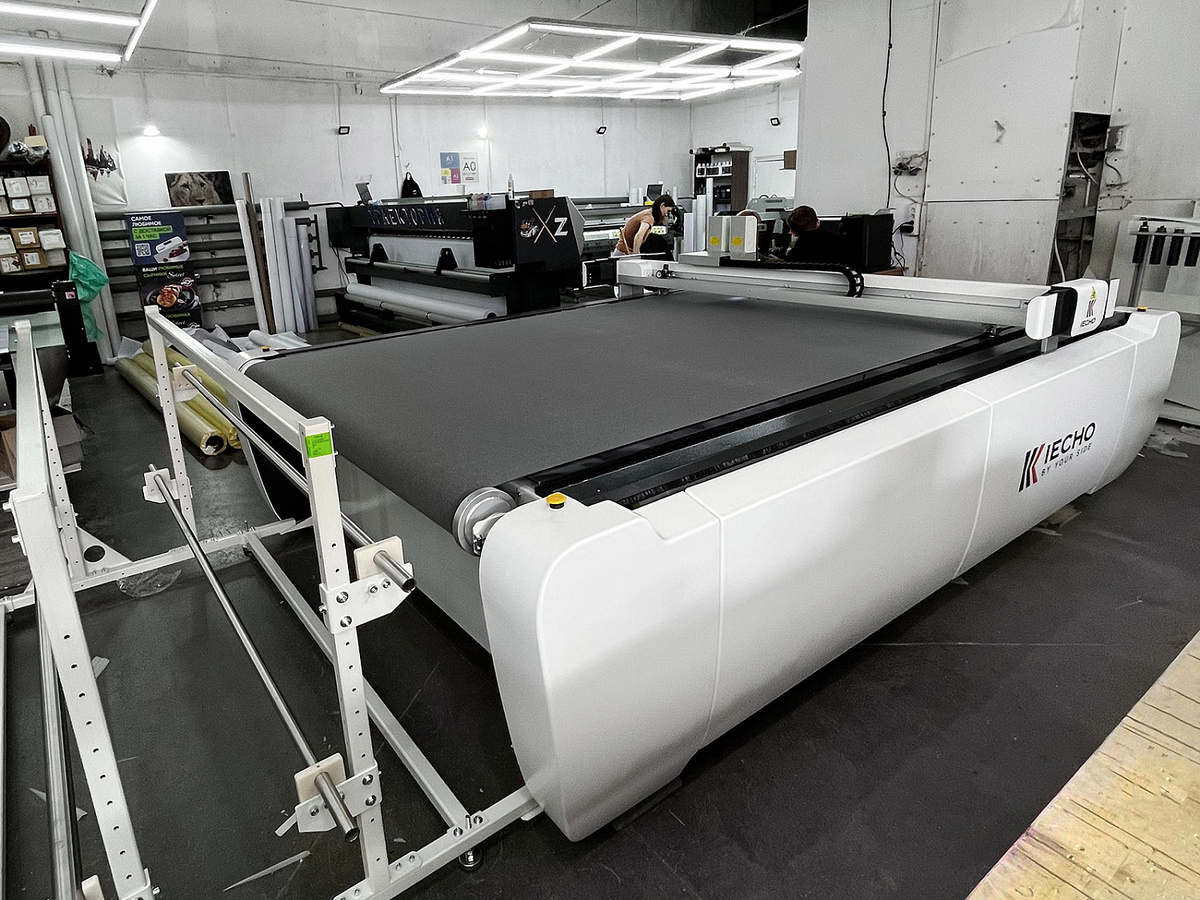 В РПК "Траектория" из Перми запущен первый в России раскройный комплекс новейшей модели iECHO BK1. Раскройщик iECHO BK1-2516 с конвейерным вакуумным столом 2,6 х 1,6 м оснащен рулонной размоткой и системой оптического позиционирования по меткам. Для обработки разных материалов толщиной до 50 мм со скоростью до 1500 мм/сек. в станке предусмотрены: универсальный тангенциальный нож UCT, электрический осциллирующий инструмент EOT, нож для самоклеящихся пленок KCT и биговщик CTT. Эта модель является самой доступной в линейке iECHO, при этом в ее арсенале есть все функции и инструментарий от старших моделей.