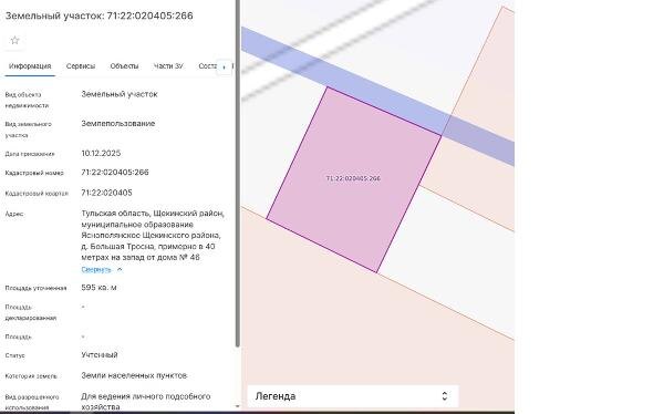 участка: Тульская область, Щекинский район, муниципальное образование Яснополянское Щекинского района, д. Большая Тросна, примерно в 40 метрах на запад от дома № 46, разрешенное использование – для ведения личного подсобного хозяйства Канал: Госземля Тульская область Область: обл Тульская Тульская область Район: Щекинский район Населенный пункт: муниципальное образование Яснополянское Щекинского района, д. Большая Тросна, примерно в 40 метрах на запад от дома № 46 Локация: Смотреть на карте ВРИ: Для ведения личного подсобного хозяйства (приусадебный земельный участок) Кадастровый номер: 71:22:020405:266 Кадастровая стоимость: - Вид сделки: Аренда Площадь: 595 м² Начальная цена: 20400.00 руб. Дата завершения: 26.03.2026 Подробнее: ГИС ТОРГИ #госземля #земляотгосударства #земля #земельныйучасток #земельныеторги #торги #аукцион #арендаземли #аренда #тульскаяобласть