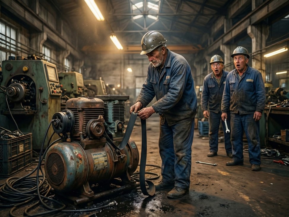 » 🔧 Инженерные истории и байки “из компрессорной” “Жигульный” ремень спас производство В одном из цехов на периферии случился коллапс: у старого поршневого компрессора лопнул ремень, а запасного — нет. Завод простаивает, начальник в панике, а местный инженер-ветеран, Иваныч, молча достаёт… старый автомобильный ремень от «Жигулей», подкладывает деревянную прокладку под шкив и стягивает всё хомутами. Через 20 минут компрессор заурчал, как довольный кот. Работали так неделю — пока не пришли новые детали. «Главное — чтобы крутилось и не стреляло», — сказал Иваныч, закуривая за вентиляцией. 💡 Мораль: Инженер — не тот, кто читает инструкции, а тот, кто пишет их задним числом. #инженерныебайки #компрессорнаяжизнь #колхозныйремонт #промышленныйфольклор #какбылораньше #ремонтнавырост #инженерныйюмор