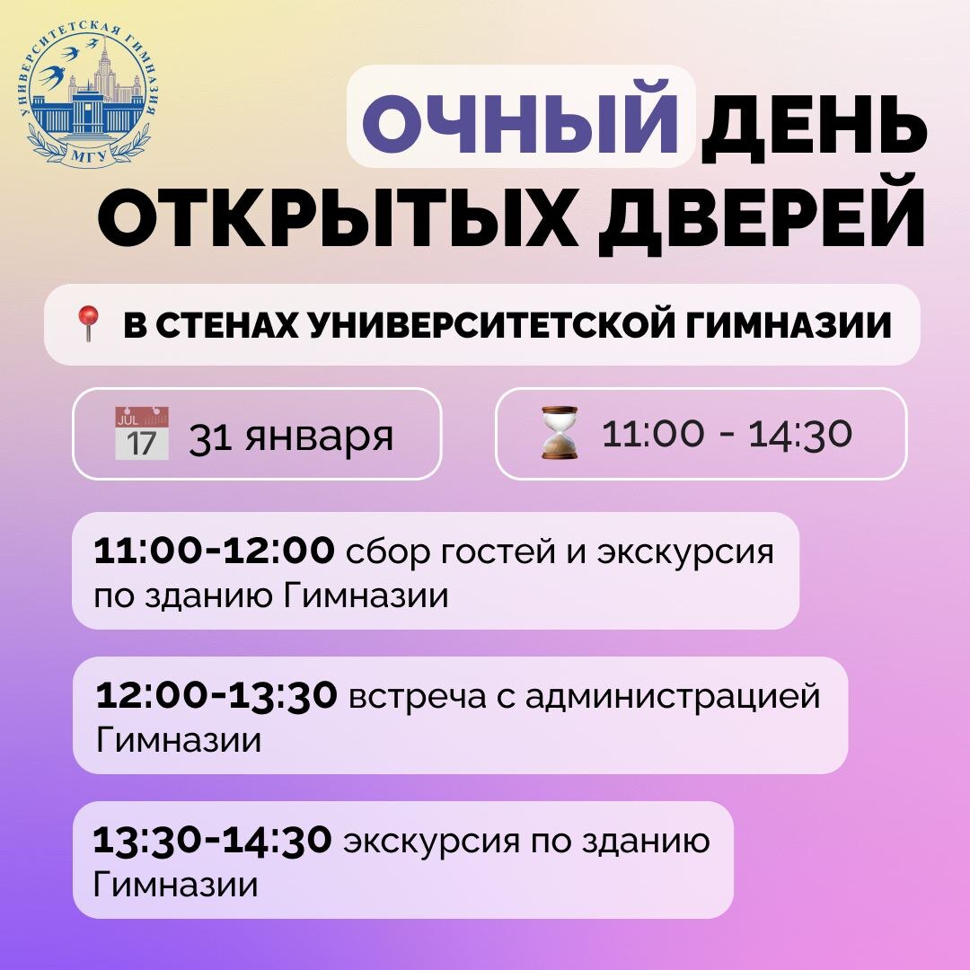 (!!!) формате. Сколько лет работаю с профильными школами, не видела предложения очного участия. Поступление в 8 и 10 класс, проживание для обучающихся. 31 января 2026 г. в Университетской гимназии МГУ, Ломоносовский проспект д. 27, корп. 7 11:00 - 12:00 Сбор гостей и экскурсия по зданию Гимназии 12:00 - 13:30 встреча с администрацией Гимназии 13:30 - 14:30 экскурсия по зданию Гимназии На входе охрана Вас попросит показать паспорт или свидетельство о рождении. Регистрация здесь Сразу вспоминаю слова Александры, моей бывшей ученицы, поступившей в Университетскую гимназию МГУ - "когда занятия по физкультуре проходят в бассейне с видом на здание МГУ, повышается мотивация учиться и поступать в МГУ". Запись аудиовстречи с Александрой публиковала здесь Надо ехать и родителям, и ученикам. Знакомимся и вдохновляемся! Математика в профильные школы