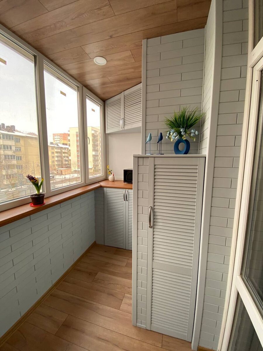 Балконы в наших домах часто превращаются в кладовки для лыж, банок и старых кресел. Но представьте, как этот уголок становится сердцем дома: местом, где вы наслаждаетесь кофе с видом на город, работаете в тишине или просто отдыхаете от суеты. Перед вами пример, где балкон не просто «добавка к квартире», а полноценная живая зона, полная тепла и уюта. Здесь каждый сантиметр продуман, чтобы радовать глаз и душу. Сразу бросается в глаза теплый деревянный потолок — он как будто обнимает пространство, делая его ниже и камернее, но при этом невероятно уютным. Это классический прием скандинавского стиля: дерево смягчает строгость белых стен и добавляет ощущение дома в лесу. Пол из светлого ламината повторяет тон потолка, создавая плавный переход и визуально удлиняя балкон. Стены отделаны светлой штукатуркой с имитацией кирпича — не слишком ярко, но достаточно текстурно, чтобы не было ощущения больничной палаты. Три больших окна пропускают море света, делая комнату легкой даже в пасмурный день