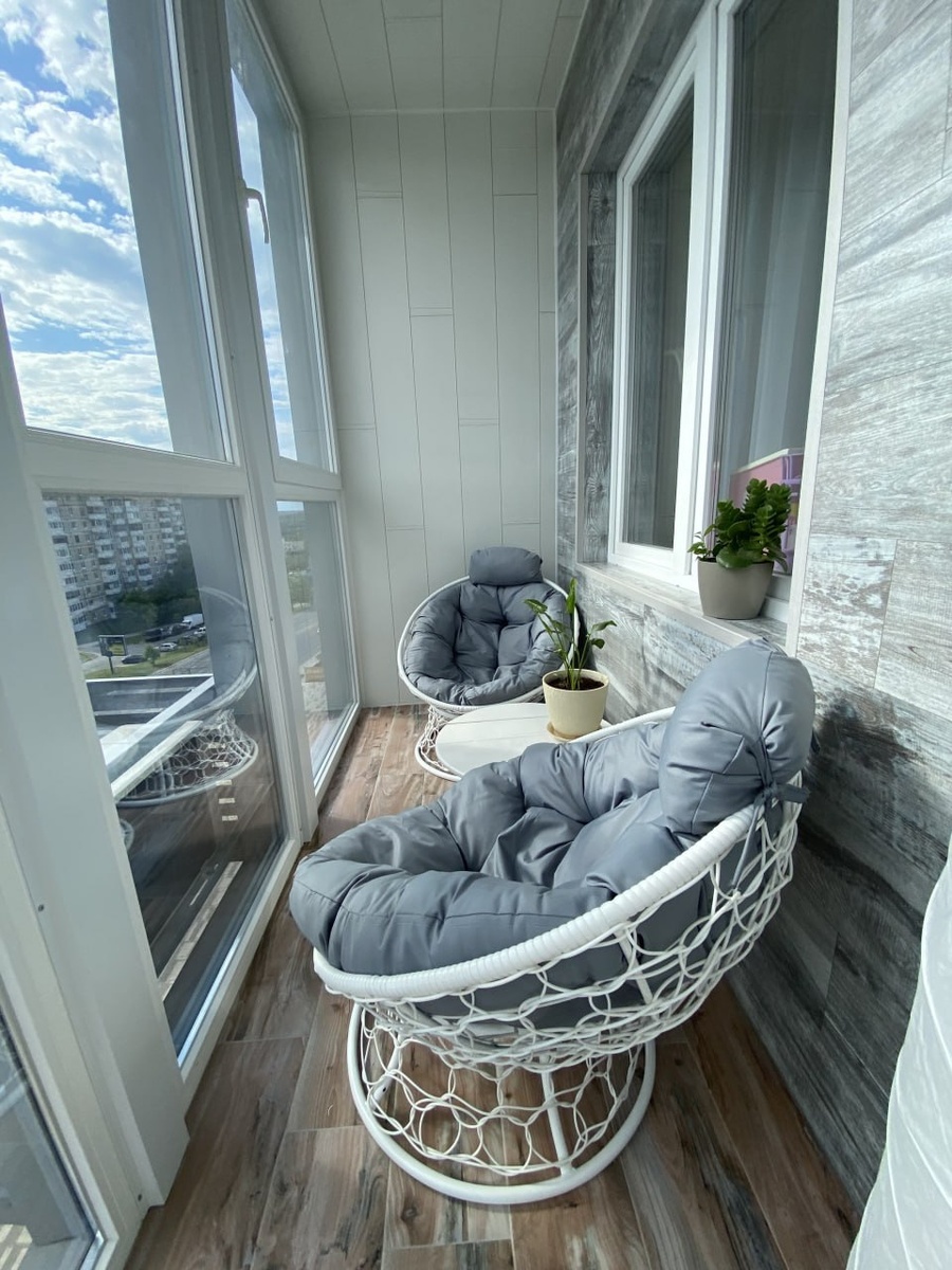 Летом балкон — райское место для отдыха, а зимой он превращается в ледяную пещеру, где даже кофе мгновенно остывает? Знакомая история. Но один раз утеплив его, вы откроете двери в круглогодичный комфорт: уютные кресла с подушками, свежий воздух даже в мороз и дополнительные метры, которые работают на вас 365 дней в году. На фото перед вами живой пример — балкон, где тепло встречается с небом, а хаос уступает место гармонии. Давайте разберемся, почему утепление меняет все. Посмотрите на это пространство: два плетеных кресла с серыми подушками стоят как приглашение сесть и расслабиться. Широкие окна пропускают солнце, создавая золотистые блики на светлом дереве пола. Утепление здесь очевидно: пол теплый под ногами, стены не потеют, а воздух свежий, без сквозняков. Растение в горшке на столике живое и зеленое круглый год — без утепления оно бы завяло от холода. Стены в серой штукатурке с текстурой дерева добавляют глубины, но не перегружают. Это не «дачный» вариант, а стильный интерьер,