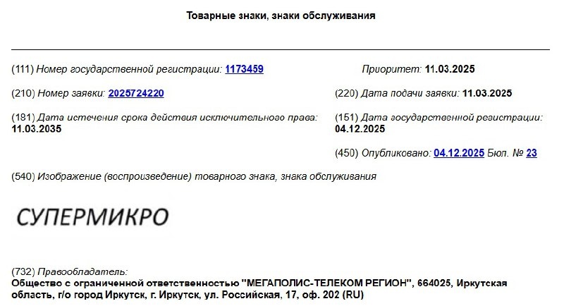 ⚠️ Российская компания успела получить права на спорный товарный знак быстрее американцев ООО «Мегаполис-Телеком Регион» из Иркутска застолбило за собой товарный знак «Супермикро». Официально зарегистрировать его удалось ещё в декабре 2025 года, и теперь на него вряд ли сможет претендовать американский производитель компьютерного «железа» Supermicro. В списке товаров и услуг, которые защитила исключительным правом «Мегаполис-Телеком Регион», два важных класса МКТУ — товары, связанные с электроникой, компьютерами, программным обеспечением, научными и техническими приборами, а также телеком-услуги. У Supermicro есть два зарегистрированных Роспатентом и действующих до 2035 года товарных знака, представляющих собой их логотип. Однако там название Supermicro написано латиницей, а российская компания зарегистрировала товарный знак на кириллице. Справка RuHard: • Supermicro — компания из США, которая специализируется на производстве серверов, материнских плат, охладительных систем и так