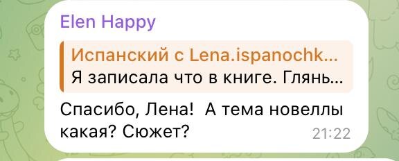 София выходит просто проветриться и внезапно попадает в разговор про деньги, любовь, смысл жизни и то, с кем вообще стоит строить отношения. Один мужчина больше про статус, машины и успех. Второй - более глубокий и философ. А потом всё вообще превращается в почти детективное ночное приключение с тайным местом, загадкой и неожиданными открытиями. Это не занудный учебник, а формат, где вы учите язык не через правила, а через живую, захватывающую историю. Книга легко читается 😊🙈☺️🇪🇸 ПРИОБРЕСТИ СО СКИДКОЙ: 🔰В любой валюте (евро, грн, доллары, дирхам....) https://cursos.lenaispanochka.es/o/novela 🔰В рублях https://app.lava.top/products/9b0ef02f-5f9d-4b68-88b0-88042fc2f417