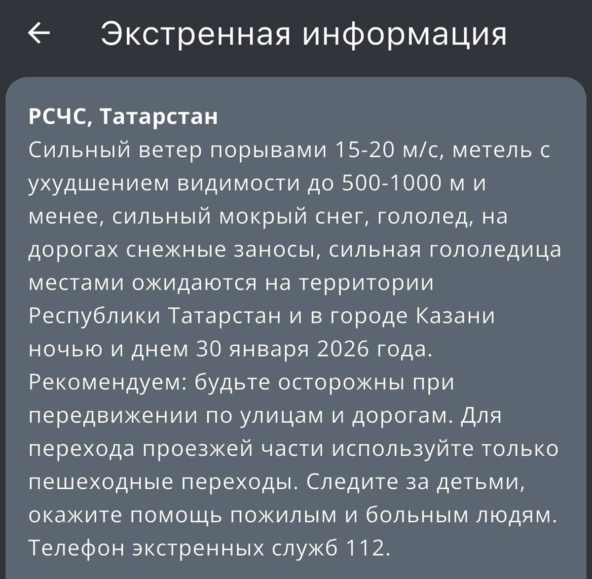 Завтра, 30 января, в республике ожидается сильный ветер порывами 15-20 м/с, метель с ухудшением видимости до 500-1000 м и менее, сильный мокрый снег, а на дорогах снежные заносы и гололедица. ⭐️ Татарстан News 📲 Татарстан News в MAX
