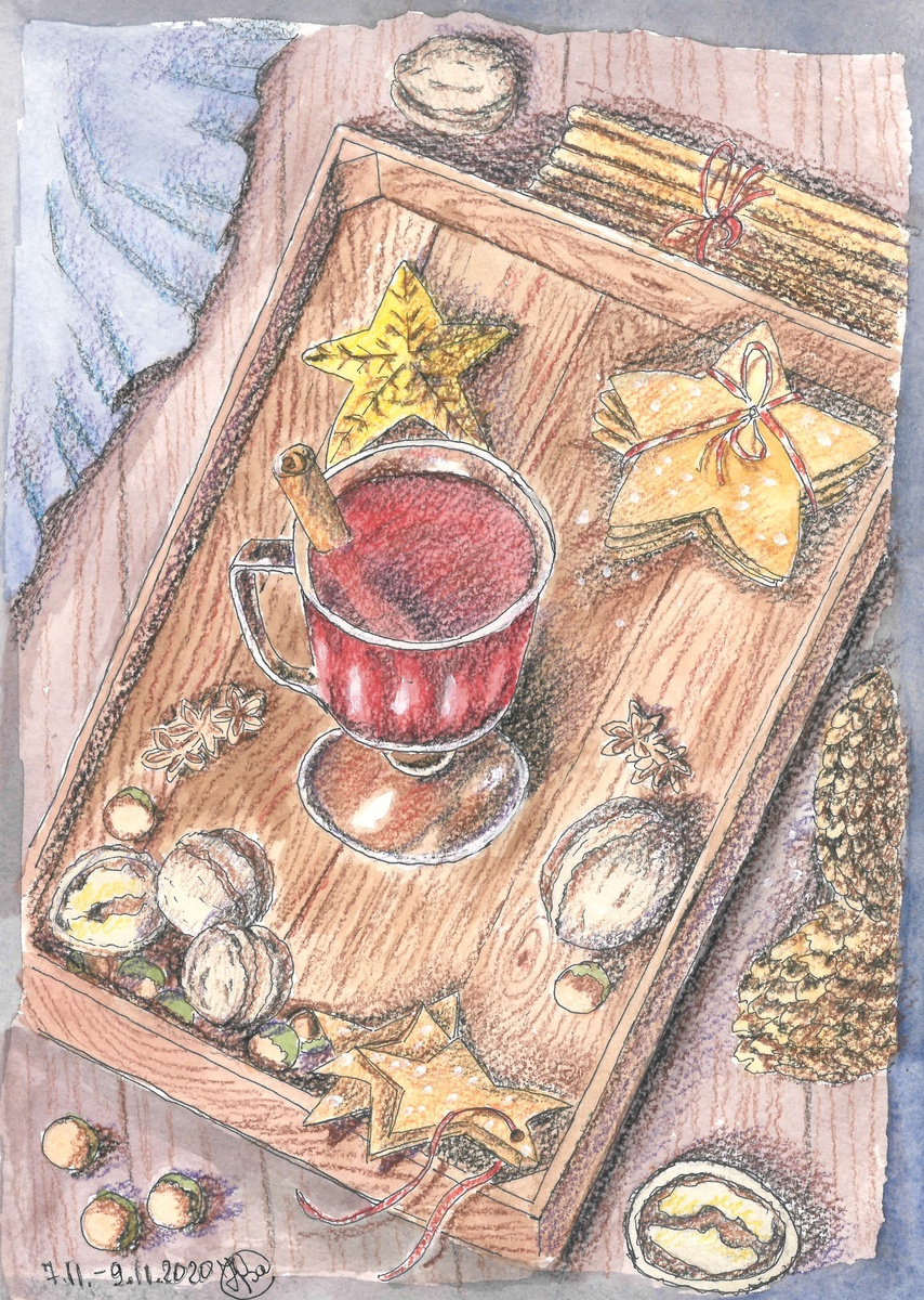 Ну что сказать про специи такого, чего бы ни знал никто? Без специй сложно представить блюда нынешней кухней, а уж разные соленья - тем паче. И по моему нет человека, который вот вообще не любил соленных огурцов, помидор, капусты. Вот такого, который бы ВООБЩЕ не любил - я лично не встречала. Ладно, вот что напишу про специи: многие из них являются лечебными. Например, мята. На основе этой запашистой, прянной травы готовят многие успокаивающие лекарства. Или вот - лично мое открытие, корица, оказывается, снижает тягу к сладкому. Вот лучше корицы добавляйте к кофе. А не лишнюю булочку.))) Впрочем, булочки тоже полезны, если они вас радуют. Но корица, оказывается, натуральный антидепрессант. В свое время по МК рисовала вот такой поднос с прянностями и глинтвейном. ) Паприка абсолютно естественным образом нормализует метаболизм, а красный и черный перец, говорят, помогают предотвратить развитие рака. У меня к перцам - спорное отношение. Мне очень нравится добавить их совсем чуть-чуть, н