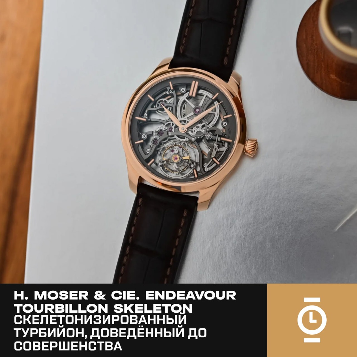 MOSER & CIE. ENDEAVOUR TOURBILLON SKELETON: СКЕЛЕТОНИЗИРОВАННЫЙ ТУРБИЙОН, ДОВЕДЁННЫЙ ДО СОВЕРШЕНСТВА #обзор_WD H. Moser & Cie. представляет Endeavour Tourbillon Skeleton — элегантные классические часы, в которых бренд максимально убрал всё лишнее, открыв строгую и честную красоту механизма. Модель объединяет классический корпус линии Endeavour и полностью скелетонизированный мануфактурный калибр HMC 814, впервые показанный в коллекции Streamliner в 2024 году. Корпус выполнен из красного золота 5N, диаметр составляет 40 мм, толщина — 10,7 мм, что делает часы удивительно тонкими для модели с парящим турбийоном. Дизайн сохраняет фирменные черты Endeavour: вогнутый полированный безель, коническую заводную головку и асимметричные боковые поверхности с сочетанием вертикального сатинирования и полированных канавок. Сапфировые стёкла установлены спереди и сзади. В центре внимания — полностью открытый механизм. Мосты и платина обработаны в антрацитовом цвете с линейной текстурой, создавая с