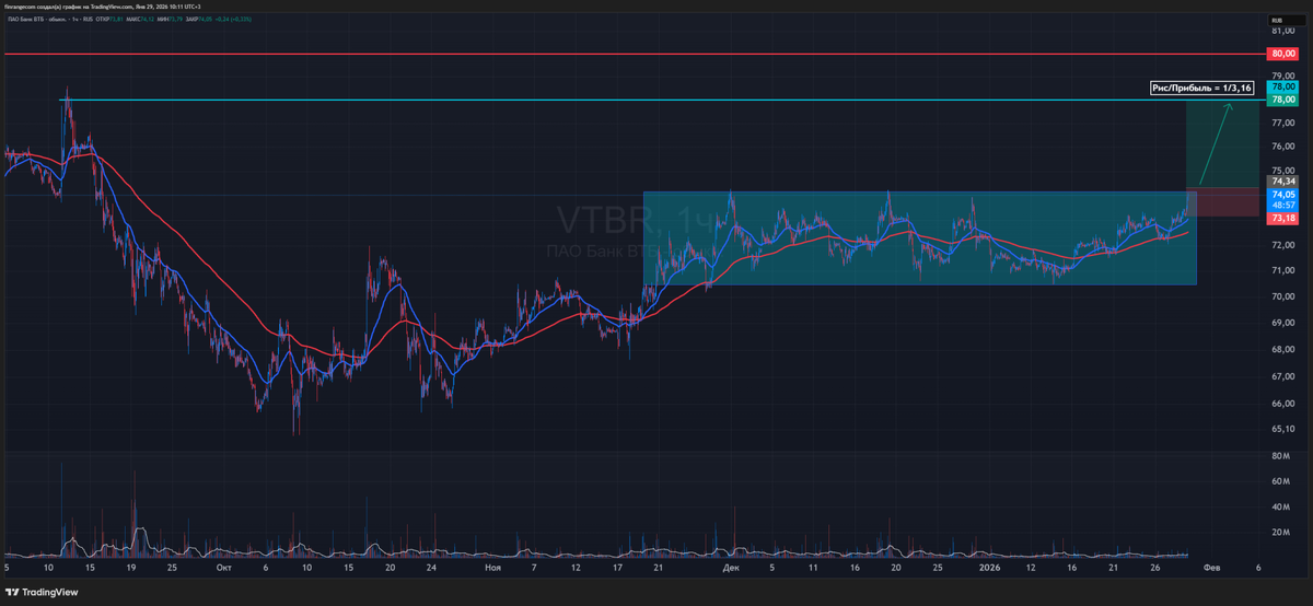 Акции ВТБ находились в консолидации около 70 дней. Сегодня на фоне общего оптимизма на рынке вышли из неё, пробив уровень сопротивления в районе 74 руб. Открывал лонг в спекулятивном портфеле вместе с участниками клуба лимитной заявкой на покупку по 74,35 руб. – выше всех последних хвостов за 70 дней. Целевые ориентиры – 78–80 руб. Соотношение риск к прибыли больше 1 к 3. Сейчас после пробоя уровня наблюдаю проторговку – это хороший технический сигнал. Это значит, что часть участников, покупавших на пробое, фиксируют прибыль, а те, кто не успел зайти, набирают позицию. Цена ниже не идёт, значит растёт вероятность выхода из проторговки вверх. Как раз крупный объём на продажу стоит около 75 руб. Если пробьём его и не выйдет негативных новостей, движение может ускориться (пока публиковал, так и получилось). P.S. В спекулятивной позиции по акциям #T сегодня зафиксировал 1/3 по 3369 руб. Держу дальше. Об идее писал здесь. Сделки в режиме онлайн получают участники клуба. Если вам близок ход
