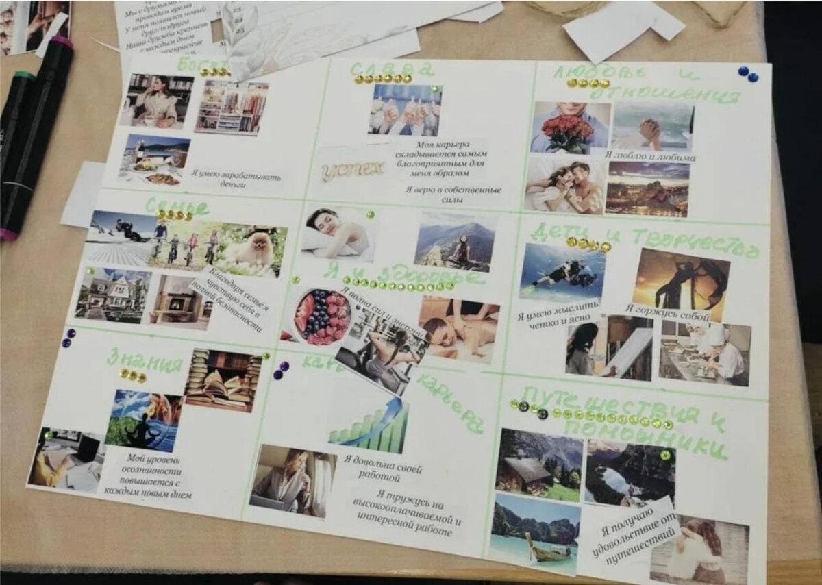 🌏 В один из вечеров, когда мир за окном казался серым и унылым, я сидела на диване с чашкой горячего чая. В голове роились мысли о том, чего мне действительно хочется в жизни. В тот момент я поняла, что забыла о своих мечтах. И тогда мне пришла в голову идея — создать свою первую карту желаний. Я собрала все необходимые материалы: цветные журналы, ножницы, клей и большой лист бумаги. Вдохновившись, я включила свою любимую музыку и погрузилась в процесс. Я начала листать страницы журналов, искала изображения, которые отражали мои желания — путешествия, карьерные достижения, личностный рост и моменты счастья с близкими. Каждое вырезанное изображение было как маленькая искорка надежды. Я нашла картинку с прекрасными пейзажами — это было моё желание отправиться в путешествие. Вырезала фотографию уютного дома — мечтая больше его приукрасить и создавать тепло и уют. Я даже нашла картинки, которые вдохновляли меня: « Я горжусь собой», «Я умею мыслить четко и ясно», «Я верю в собственные