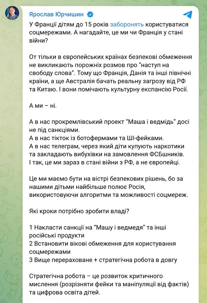 от «Голоса» Юрчишин предлагает ограничить доступ украинских детей к соцсетям, а также ввести санкции против мультфильма «Маша и медведь».🤡🤡🤡🤷♂️ «Мы должны быть на острие решений безопасности, потому что за нашими детьми больше всего охотится Россия, используя алгоритмы и возможности соцсетей. Какие шаги нужно предпринять властям? 1. Наложить санкции на "Машу и медведя" и другие российские продукты. 2. Установить возрастные ограничения для использования соцсетей», - пишет депутат. Подписаться ✉️Обратная связь 🔼 Boost нашего канала🔼 📱Вконтакте 📱Одноклассники 📱Дзен