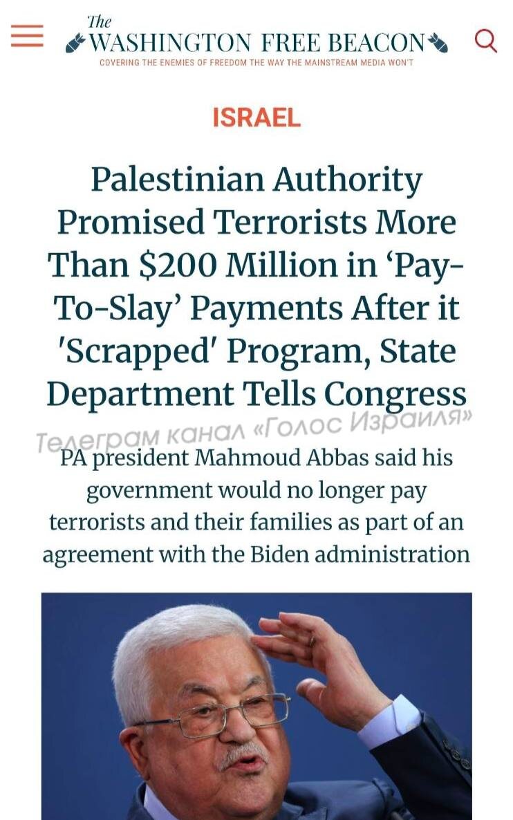 взятые обязательства прекратить эти выплаты. Washington Free Beacon сообщает, что Государственный департамент США передал Конгрессу разведывательные материалы, согласно которым громкие обещания Абу Мазена (Махмуда Аббаса) Западу свернуть политику Pay to Slay оказались фикцией . Палестинская национальная администрация не прекратила выплаты, а лишь перепаковала их через другой канал — так называемый «механизм социального обеспечения», чтобы скрыть продолжение финансирования террористов от западных доноров. ____________ 🎙Будь в курсе событий 🇮🇱 Подпишись на «Голос Израиля»