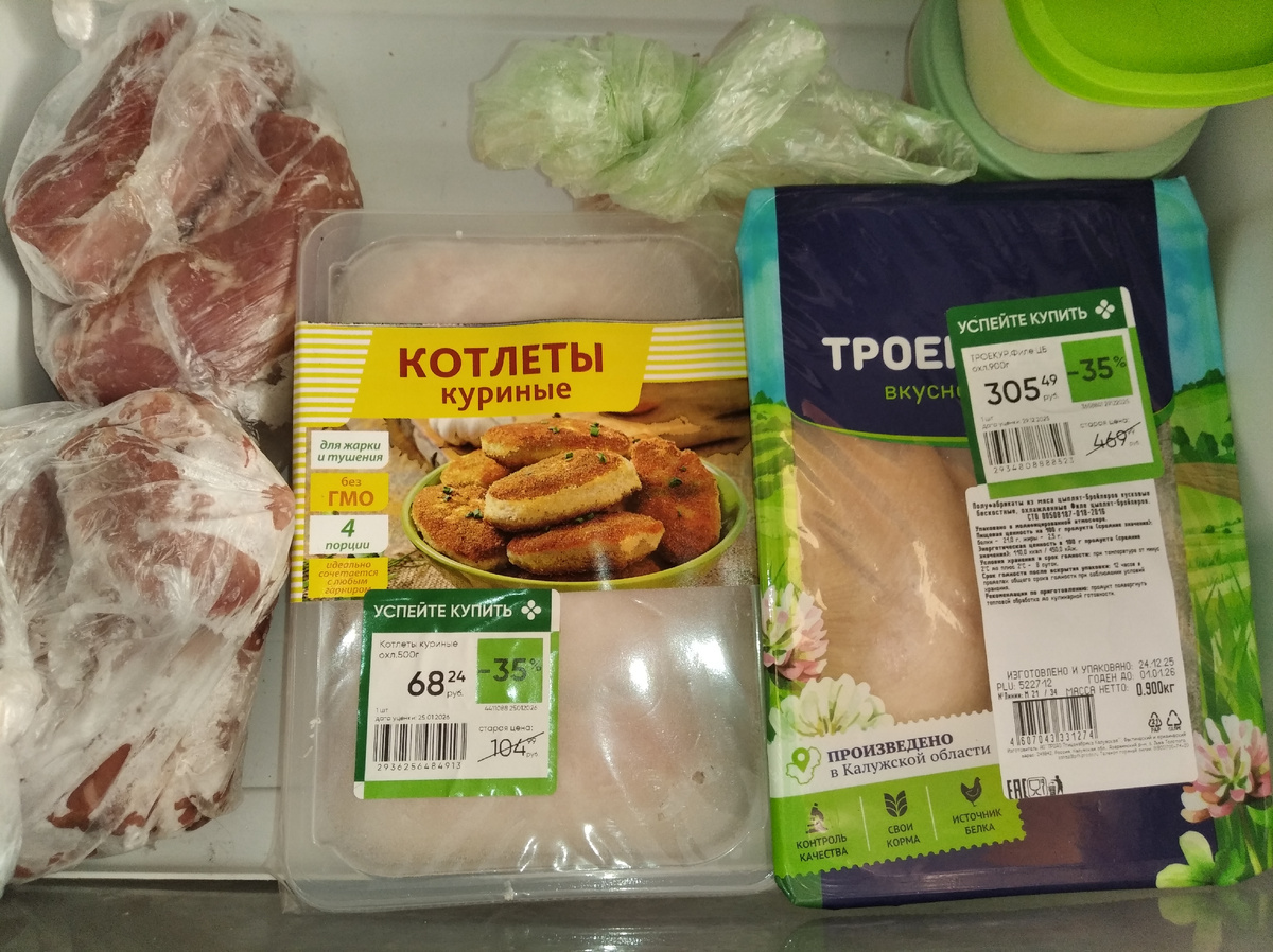 В морозилке лежит еще пачка "дешевых" котлет, писала уже, что они очень похожи на котлеты из магазина Ермолино, пачка филе грудок, два пакета индюшиных шей на супы. А так же пачка на 800 грамм минтая и полтора килограмма салаки мороженой.
