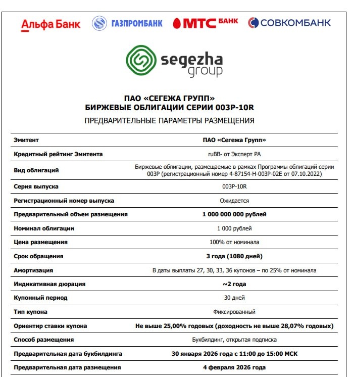 Что нужно знать инвестору перед новым выпуском Сегежи? Уже завтра стартует прием заявок на новые облигации Сегежи. Компания выходит с очередным выпуском в момент, когда интерес к доходным корпоративным бумагам сохраняется, а ожидания по ключевой ставке все еще остаются двузначными. Полноценный разбор компании и данного выпуска уже публиковался ранее, поэтому здесь решили напомнить самое главное: основные параметры и о том, что здесь действительно важно инвестору. ➖Параметры выпуска: ▪️Объм размещения: 1 млрд руб. ▪️Срок обращения: 3 года (1080 дней) ▪️Купон: фиксированный, выплаты каждые 30 дней ▪️Ориентир купона: до 25% годовых ▪️Ориентир доходности: до 28,07% годовых ▪️Дата сбора заявок: 30 января с 11:00 до 15:00 ▪️Дата размещения: 4 февраля 2026 года ▪️Выпуск доступен неквалифицированным инвесторам (после тестирования) ▪️Амортизация: в последние 12 месяцев номинал погашается четырьмя равными траншами по 25%. Почему размещение может представлять интерес? ➖Баланс уже после ключ
