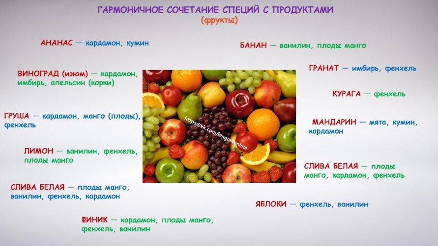 🥝 ФРУКТЫ: АНАНАС — кардамон, кумин. БАНАН — ванилин, плоды манго. ВИНОГРАД (изюм) — кардамон, имбирь, апельсин (корки). ГРАНАТ — имбирь, фенхель. ГРУША — кардамон, манго (плоды), фенхель. КУРАГА — фенхель. ЛИМОН — ванилин, фенхель, плоды манго. МАНДАРИН — мята, кумин, кардамон. СЛИВА БЕЛАЯ — плоды манго, ванилин, фенхель, кардамон. СЛИВА БЕЛАЯ — плоды манго, кардамон, фенхель. ФИНИК — кардамон, плоды манго, фенхель, ванилин. ЯБЛОКИ — фенхель, ванилин.
