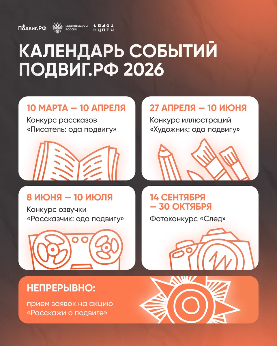 ! Представляем календарь событий от «Подвиг.РФ» — впереди целый год возможностей: участвуй, раскрывай свои таланты и делись значимыми историями. Старт первого конкурса — уже 10 марта! Чтобы не пропустить начало: → подпишись на нашу рассылку в ВК; → мы пришлем тебе уведомление о старте конкурса. 🧡Подвиг.РФ | Поддержать канал голосом #подвигрф #календарьсобытий