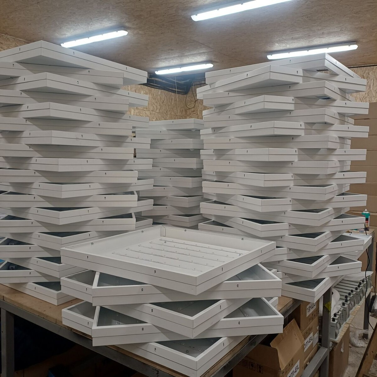 Текущий этап производства крупной партии светильников от «Светлых идей», предназначенных специально для модульных подвесных потолков