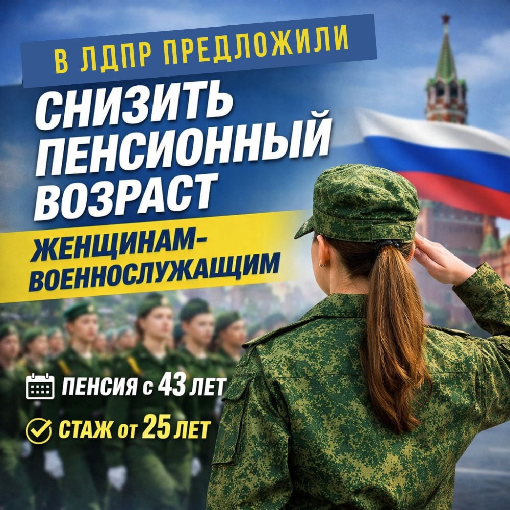 🔝 В ЛДПР внесли в Государственную Думу законопроект, предусматривающий снижение пенсионного возраста для женщин, проходивших службу в армии, МВД и Росгвардии. Инициатива направлена на восстановление социальной справедливости для женщин, которые были вынуждены уволиться со службы по семейным обстоятельствам. ➡ В партии отметили, что сегодня многие женщины, отдавшие более 12 лет службе Родине и имеющие общий трудовой стаж не менее 25 лет, лишаются права на военную пенсию из-за формального возрастного ограничения. При этом необходимость ухода за детьми или близкими родственниками становится причиной вынужденного завершения службы. ➡ Законопроектом предлагается установить право выхода на пенсию по выслуге лет для женщин с 43 лет и для мужчин с 45 лет при наличии общего трудового стажа не менее 25 лет и увольнении по состоянию здоровья, семейным обстоятельствам либо в связи с организационно-штатными мероприятиями. ➡ В партии подчеркнули, что инициатива не вводит новых льгот, а устраняет